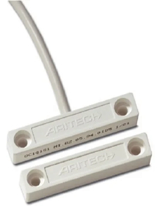 Een magneetcontact die bij opening van ramen/deuren onderbreekt.